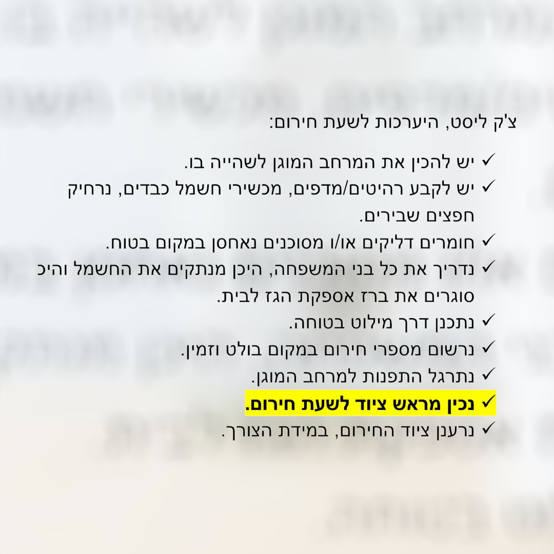 אם כך, מוכנות אינה, היבט נפשי בלבד, שהוא בהחלט לא פחות חשוב, אבל עלינו לפרוט אותה לצעדים פרקטיים; לפנות דרך מילוט, להכין את הממ"ד או המקלט, להתמגן ולהצטייד. טוב שנעשה זאת בהקדם, יפה שעה אחת קודם, נכין בשיגרה את מה שנזדקק לו בשעת חירום, לעת מלחמה.